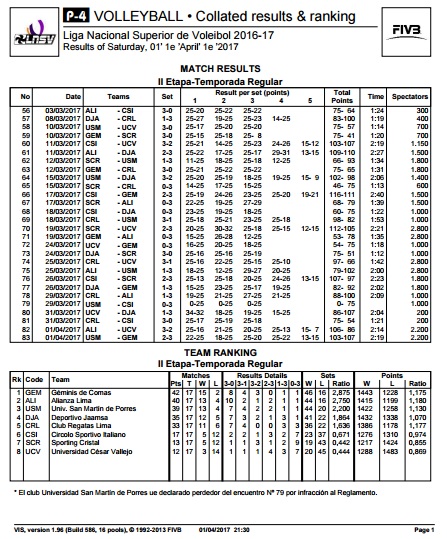 El marcador a favor del equipo comeño fue (25-20; 21-25; 25-23; 25-22) en 2 horas 6 minutos de juego en el coliseo Manuel Bonilla de Miraflores, donde el sexteto dirigido por el técnico brasilero Marco Queiroga hizo un gran esfuerzo para imponerse en el bloqueo (12-11) y tratar de superar el ataque (50-52) y servicio (4-7) que estuvo a favor de Túpac Amaru.