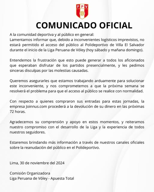 A la comunidad deportiva y al público en general: Lamentamos informar que, debido a inconvenientes logísticos imprevistos, no estará permitido el acceso del público al Polideportivo de Villa El Salvador durante el inicio de la Liga Peruana de Võley (hoy sábado y mañana domingo).